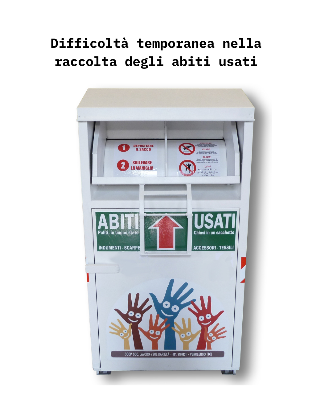 La Cooperativa Lavoro e Solidarietà che si occupa della raccolta dei rifiuti tessili nel nostro territorio ha subito un grave atto vandalico che non le permetterà nei prossimi giorni di eseguire regolarmente il servizio di raccolta.