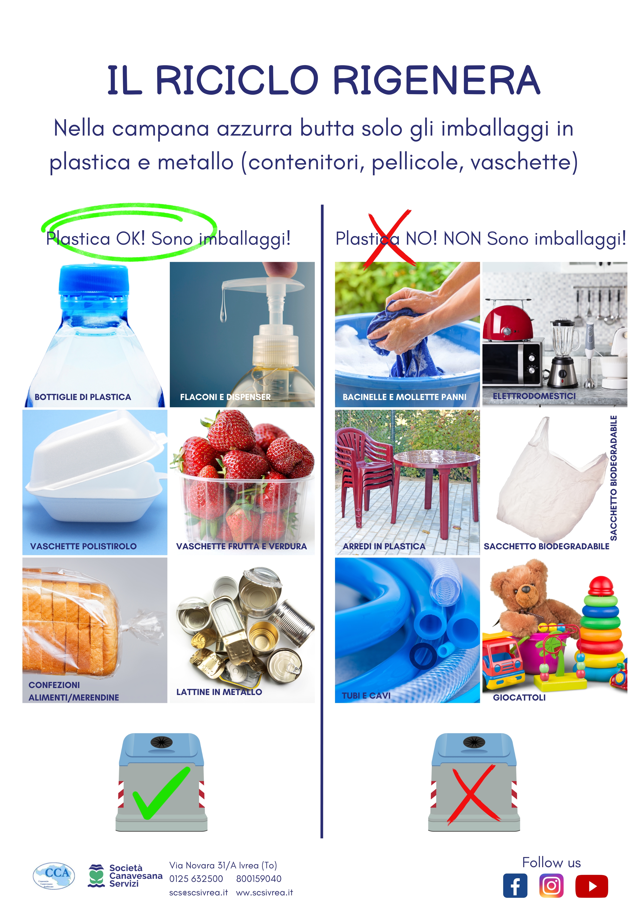 La Società Canavesana Servizi (SCS) sta diffondendo una campagna di sensibilizzazione sulla raccolta differenziata degli imballaggi in plastica e metallo. Si invita a consultare il manifesto allegato e il sito dell'SCS .