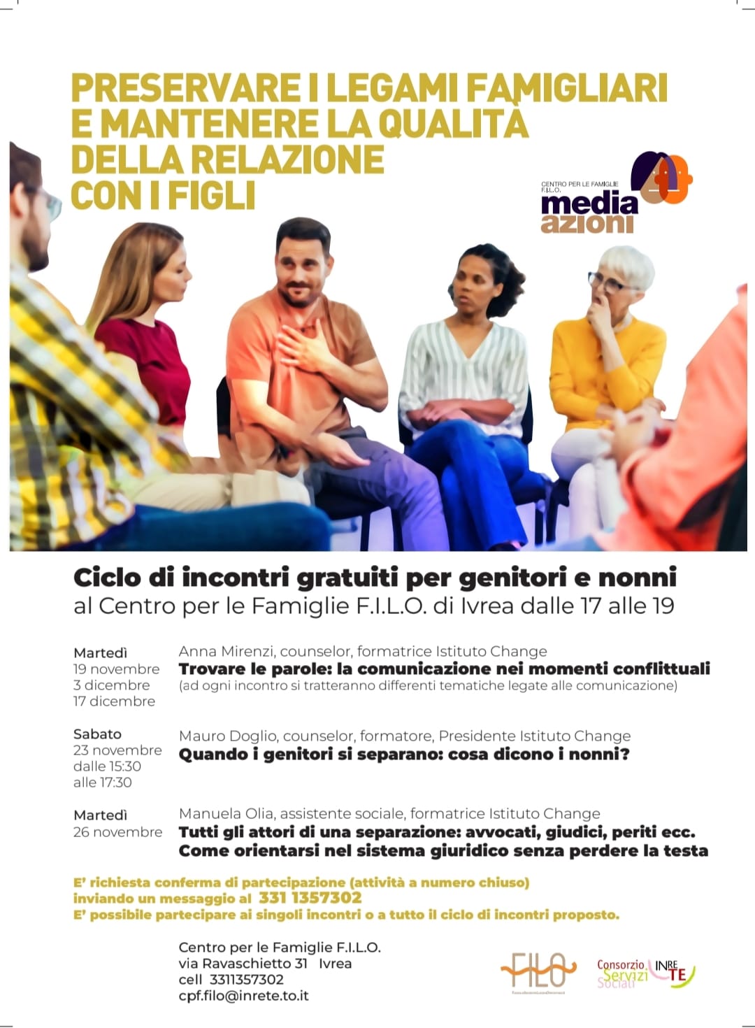Martedì 26 novembre si terrà il terzo incontro dalle 15,30 alle 17,30 presso il Centro Famiglie in via Ravaschietto 31 a Ivrea.